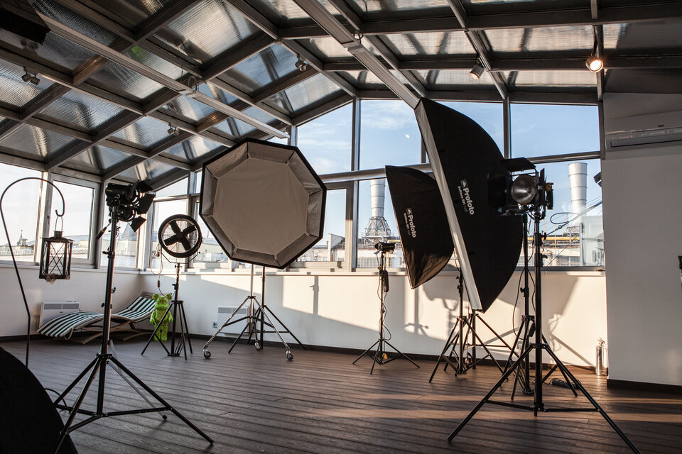 Зал «Крыша» состоит из двух частей , это 80 метровое закрытое тёплое помещение и 200м открытая веранда с видом на центральную часть Москвы. Зал оснащен передвижной системой фонов (которую можно легко перенести даже на улицу), импульсными источниками Profoto, отражателями, собственной гримерной и уборной с душем.